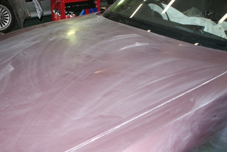 PPGのハーレークイーンレインボーカラーの塗装をするために古い塗装の表面に小さなキズをつけて密着や塗り肌などの品質アップします。