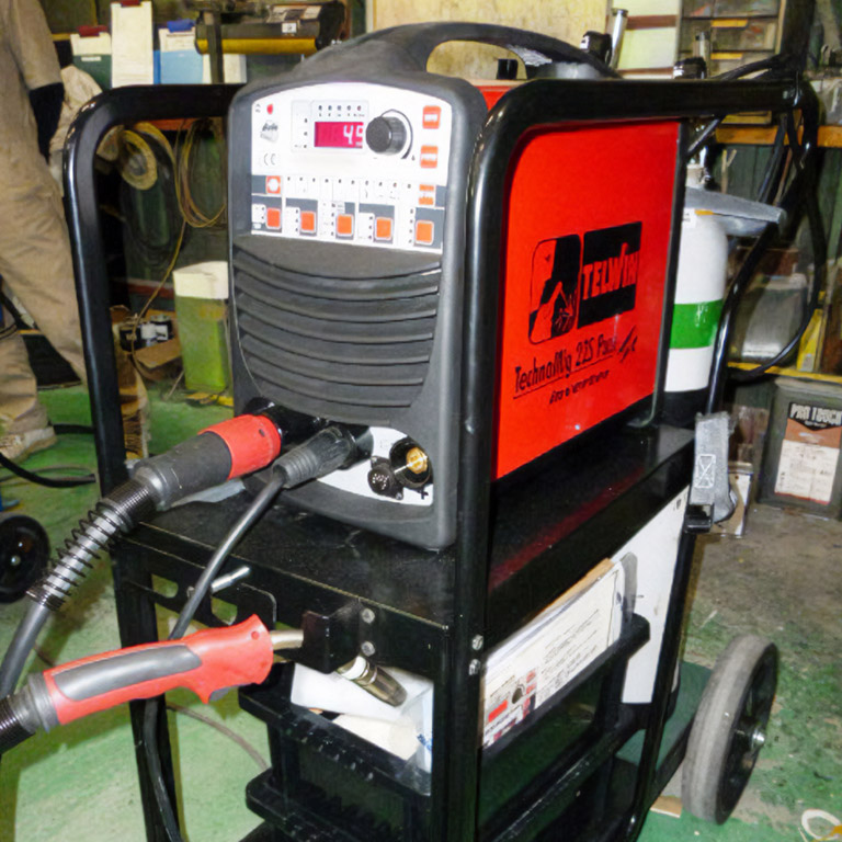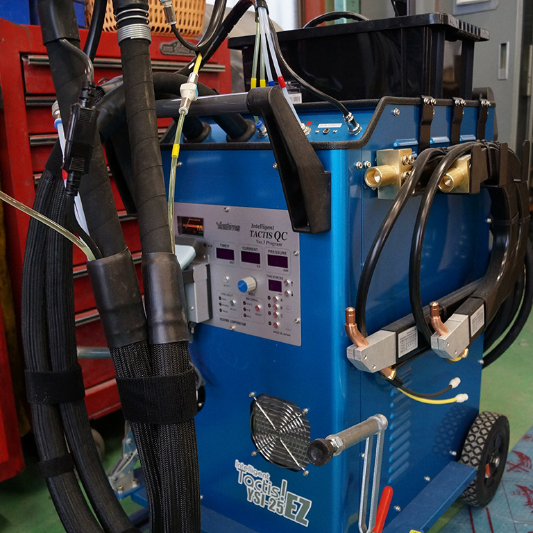 - 車種ごとに圧力、電力を自動調整できる最新型の「スポット溶接機」と「パルスMIG溶接機」